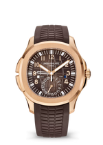 Dial Sunburst brown, embossed Aquanaut pattern, rose gold applied numerals with white luminescent coating. Local time hand: rose gold baton-style with white luminescent coating. Home time hand: white gold skeletonized baton-style hand, white varnished. Case...