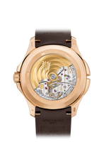 Dial Sunburst brown, embossed Aquanaut pattern, rose gold applied numerals with white luminescent coating. Local time hand: rose gold baton-style with white luminescent coating. Home time hand: white gold skeletonized baton-style hand, white varnished. Case...